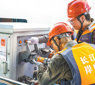 国网宜昌供电公司岸电运维人员为靠泊船舶接通岸电。