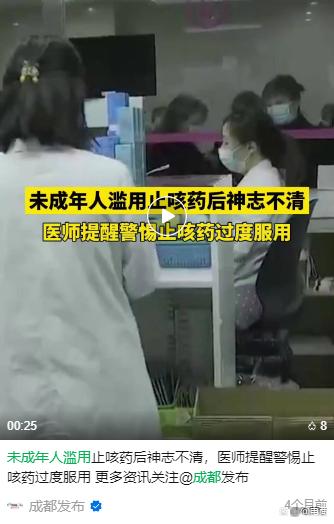 4个月前,四川成都警方发现了4名未成年人存在滥用右美沙芬片,其中有3名人员出现手舞足蹈、精神亢奋的状况,另外一名则神志不清、认知模糊,被送往医院救治。