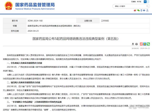 就在近日,国家药监局公布了第五批药品网络销售违法违规典型案例,其中包括了京东、美团入驻商家。