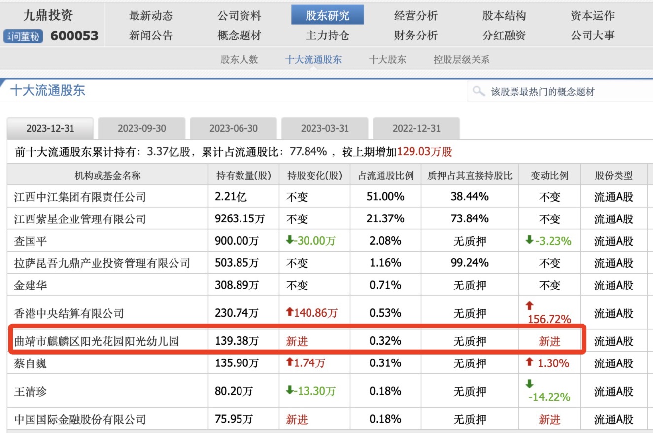 去年四季度,曲靖市麒麟区阳光花园阳光幼儿园(以下简称:阳光花园阳光幼儿园)首度跻身九鼎投资前十大流通股东,排名第七,共计持有139.38万股。若以去年四季度15.77元的股票均价计算,买入139.38万股,阳光花园阳光幼儿园投入金额约为2198.02万元。即使以该季度最低股价11.74元计算,阳光花园阳光幼儿园也至少得投入约1636.32万元。