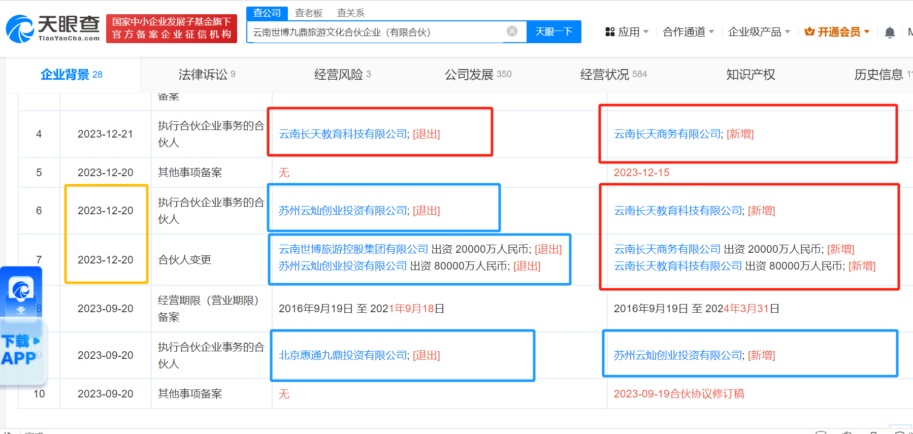 同年12月,云南世博旅游控股集团与苏州云灿创投同时退出,云南长天教育、云南长天商务有限公司(以下简称:云南长天商务)成为云南世博九鼎新晋合伙人。
