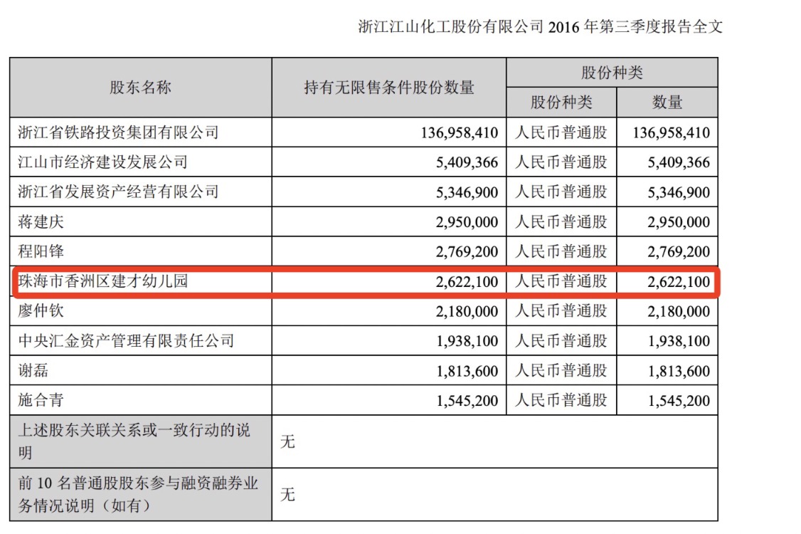 2016年三季度,珠海市香洲区建才幼儿园新进原*ST江化的前十大流通股东,并以262.21万股的持股数量排名第六。据当年年报,该幼儿园已于四季度退出十大流通股东行列。