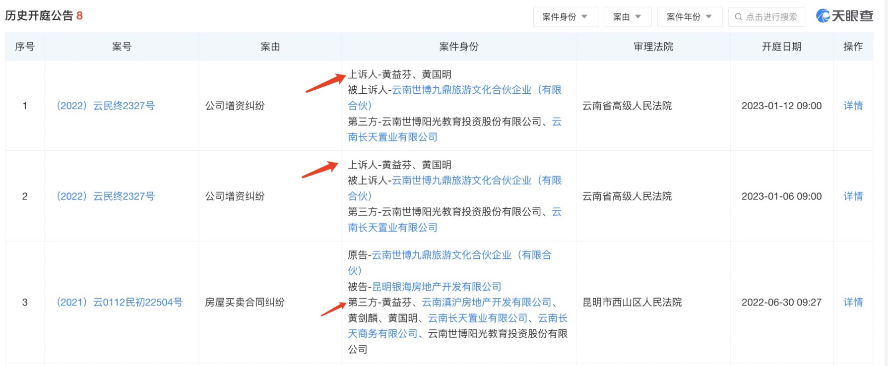 在天眼查披露的3次历史开庭公告中,因公司增资纠纷,云南世博九鼎作为被上诉人,黄益芬、黄国明作为上诉人,于2023年1月两度对薄公堂,审理法院为云南省高级人民法院,其中牵扯到的第三方均包括云南世博阳光、云南长天置业。