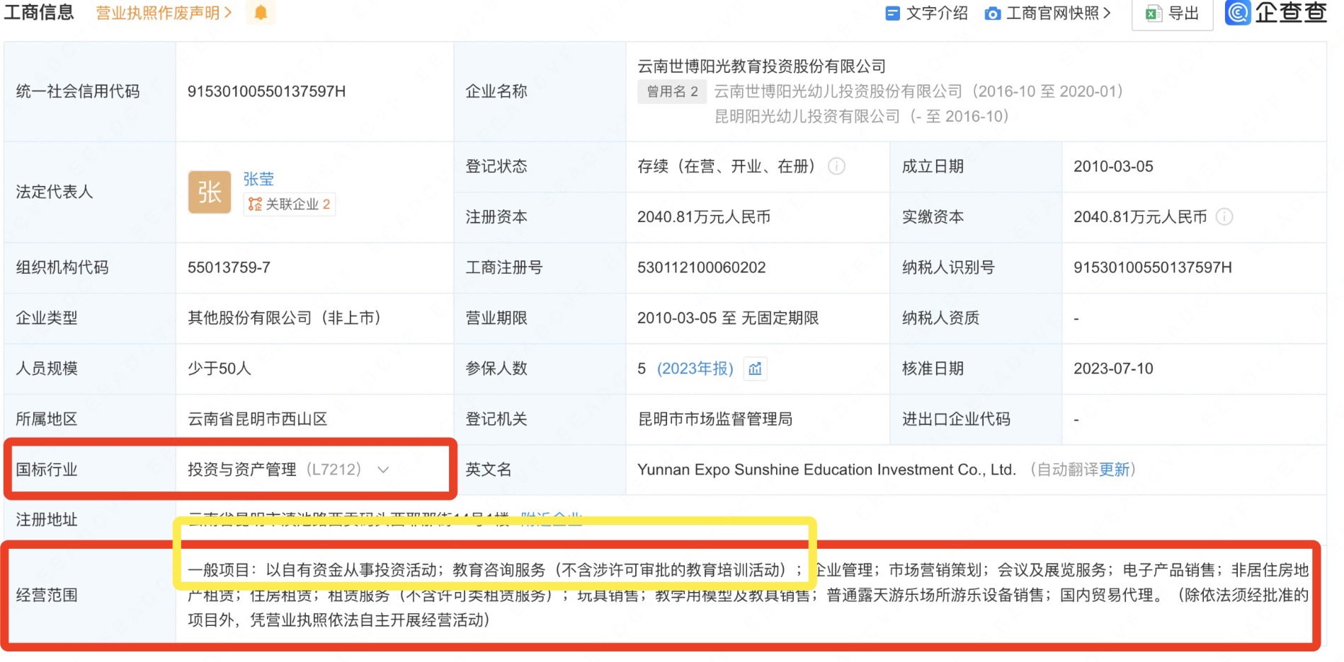由企查查可得,王爱平关联了7家企业,其中包括云南世博阳光教育投资股份有限公司(以下简称:云南世博阳光)。企查查显示,云南世博阳光成立于2010年3月,董事长兼总经理、董事分别由张莹、王爱平担任。该企业在国标行业一栏显示为投资与资产管理,经营范围首先包括了以自有资金从事投资活动、教育咨询服务(不含涉许可审批的教育培训活动)等。