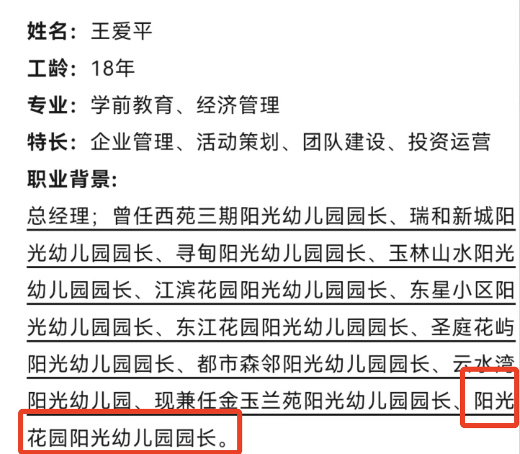 云南世博阳光的公众号指出阳光幼儿园创办于2003年,世博阳光《园区分布及介绍》一文介绍了王爱平的相关资料。资料显示,王爱平已有18年工龄,是世博阳光的总经理,曾任阳光幼儿园多个分园园长,现兼任金玉兰苑阳光幼儿园、阳光花园阳光幼儿园,后者便是九鼎投资去年四季度的新晋十大流通股东。