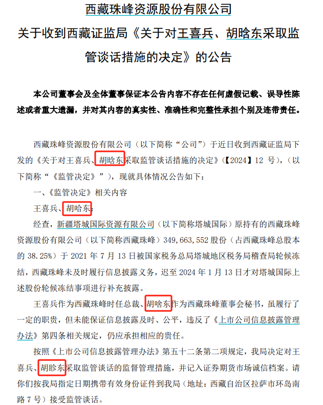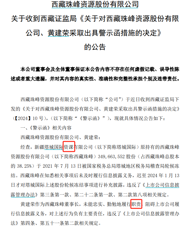 随后,西藏证监局对西藏珠峰及董事长黄健荣、董秘胡晗东出具警示函。
