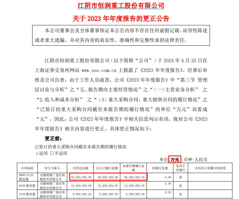 4月25日晚间,恒润股份对2023年年报进行更正。由于工作人员疏忽,对恒润股份部分报表中单位“万元”误看成“元”,导致年报列示的多项合同总金额惊人。