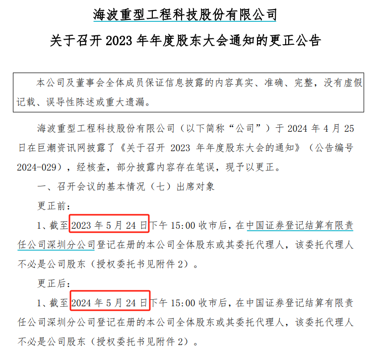 4月25日晚间,海波重科对召开2023年年度股东大会通知一事进行更正,将召开会议的出席对象截至时间由“截至2023年5月24日”更正为“截至2024年5月24日”,时间差了一整年。