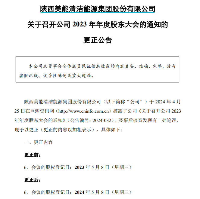 类似的笔误在近期密集出现。4月25日中午,美能能源也对2023年年度股东大会的通知进行更正,同样是股权登记日的“2024年”写成了“2023年”。