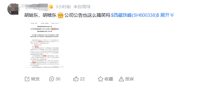 其中,西藏珠峰董事会秘书胡晗东的名字出现了四个版本,分别为胡晗东、胡哈东、胡啥东、胡眕东。由于董事会秘书是上市公司信息披露的主要负责人,董秘自己名字出错显得格外讽刺,因而招致大量网友点评,追问董秘到底是“胡啥东”。