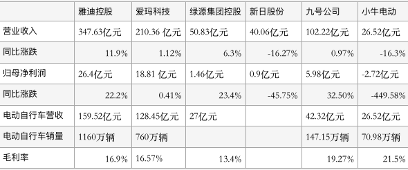 随着新日股份2023年财报发布,截至目前,雅迪控股、爱玛科技、绿源集团控股、九号公司、小牛电动等电动自行车上市公司财报均已出炉。