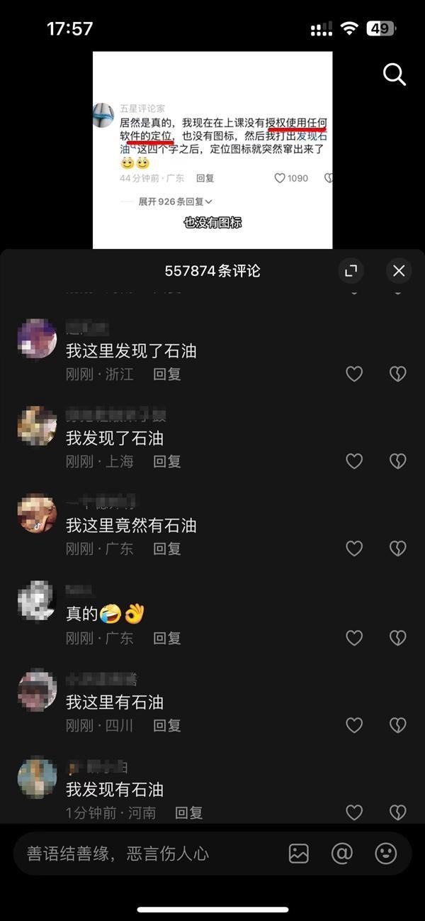 近日,短视频平台上出现了评论“发现石油”“我这里发现大量石油”等内容,引发了热议。据了解,有网友在评论区发送这类内容后,iPhone会自动打开手机定位功能,导致用户对苹果手机是否在收集、发送位置信息产生质疑。