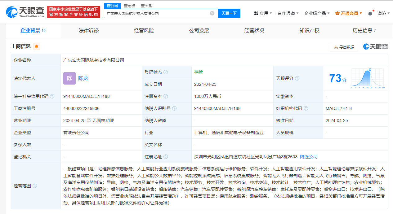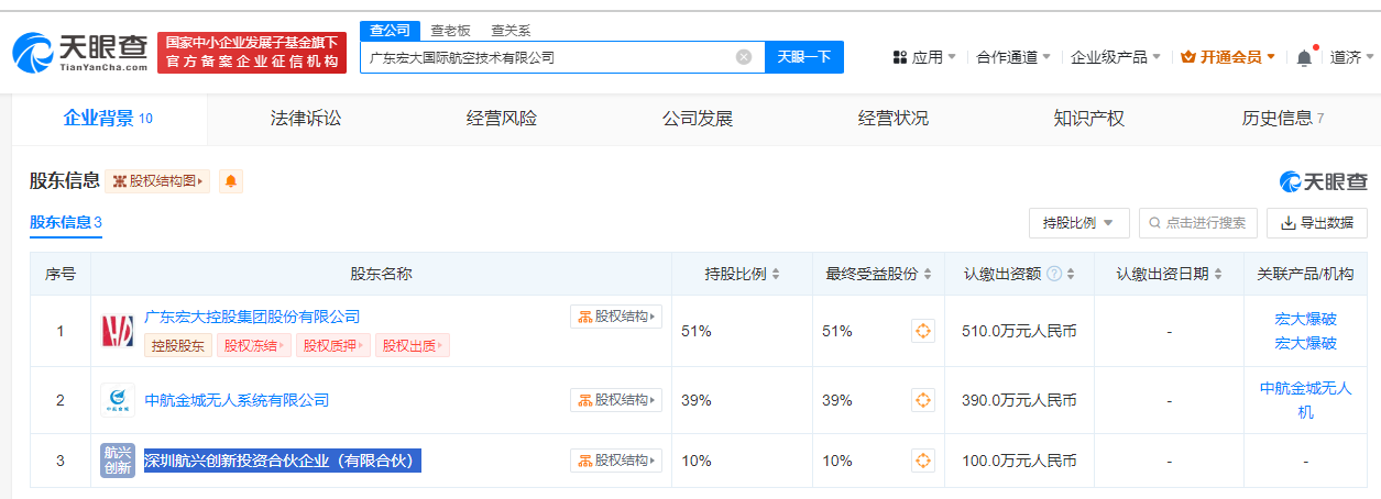 天眼查App显示,近日,广东宏大国际航空技术有限公司成立,法定代表人为陈龙,注册资本1000万人民币,经营范围含地理遥感信息服务、人工智能行业应用系统集成服务、人工智能应用软件开发、人工智能理论与算法软件开发、人工智能基础软件开发、智能无人飞行器制造、智能无人飞行器销售等。股东信息显示,该公司由广东宏大(002683)、中航金城无人系统有限公司、深圳航兴创新投资合伙企业(有限合伙)分别持股51%、39%、10%。