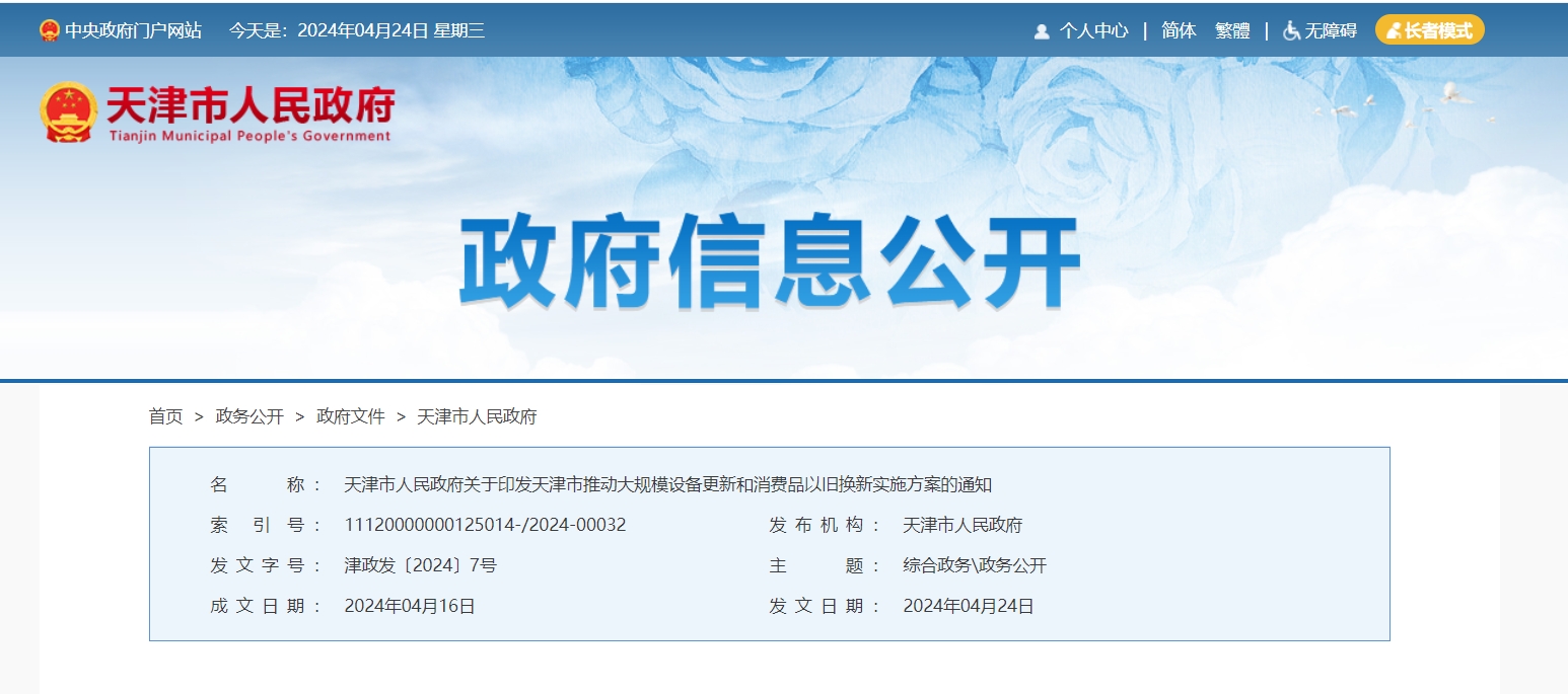 4月24日,天津市人民政府网站发布《天津市人民政府关于印发天津市推动大规模设备更新和消费品以旧换新实施方案的通知》。其中提出,目标到2027年,工业、农业、建筑、交通、教育、文旅、医疗等领域设备投资规模较2023年增长25%以上。重点行业主要用能设备能效基本达到节能水平。规模以上工业企业数字化研发设计工具普及率、关键工序数控化率分别超过90%、75%。报废汽车回收量比2023年增加约一倍,二手车交易量比2023年增长45%,废旧家电回收量较2023年增长30%。再生材料在资源供给中的占比进一步提升。