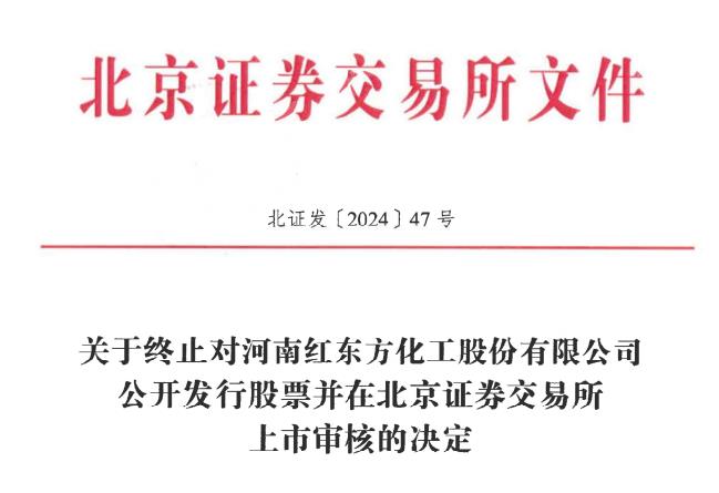 北京4月24日讯 据北交所官网消息,北交所决定终止河南红东方化工股份有限公司(以下简称“红东方”)公开发行股票并在北京证券交易所上市审核的决定。