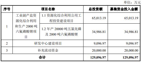 红东方原拟募集资金129,096.97万元,分别用于工业副产盐资源化综合利用和生产2000吨六氟磷酸锂项目、研发中心建设项目、补充流动资金。