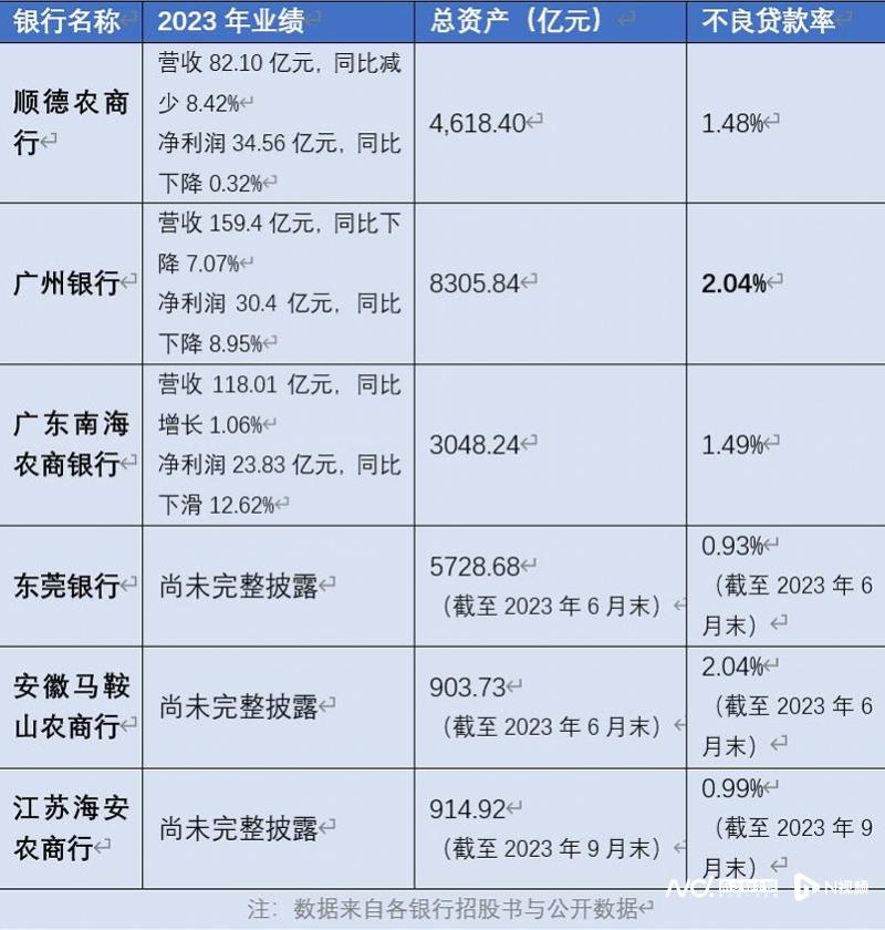 顺德农商行和广州银行2023年营收和净利润双降。据顺德农商行披露的2024年度同业存单发行计划,顺德农商行去年营业收入为82.10亿元,同比减少8.42%;净利润34.56亿元,同比下降0.32%。该行不良贷款率为1.48%,较2022年末上升0.26个百分点,总资产为4,618.40亿元。