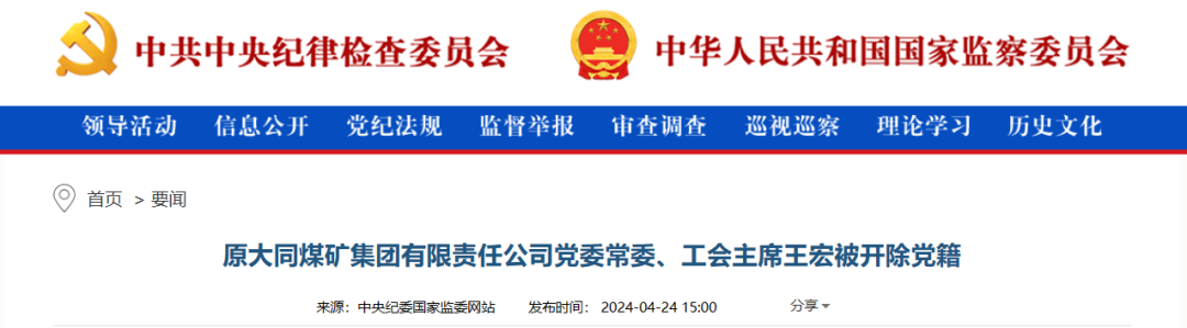 据中央纪委国家监委网站消息,据山西省纪委监委消息:日前,经山西省委批准,山西省纪委监委对原大同煤矿集团有限责任公司党委常委、工会主席王宏严重违纪违法问题进行了立案审查调查。