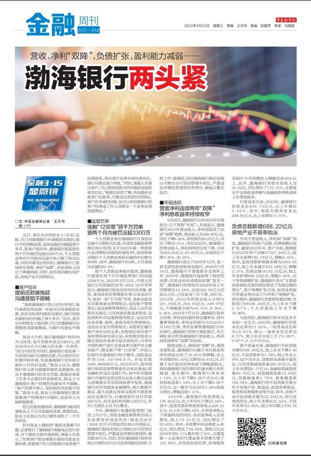 近日,来自长沙的陈女士(化名)反映,自己向渤海银行申请提前还款时,银行不但消极处理,还将还款时间拖延两个多月。除客户投诉外,渤海银行更是曾在两个月内被罚没超3300万元,个人贷款业务在行内投诉总量中也占据了较大比重。内控问题突出的同时,渤海银行已连续两年营收、净利“双降”,利息净收入同比下降逾两成。同时,其负债总额出现扩张,房地产业不良率抬头。
