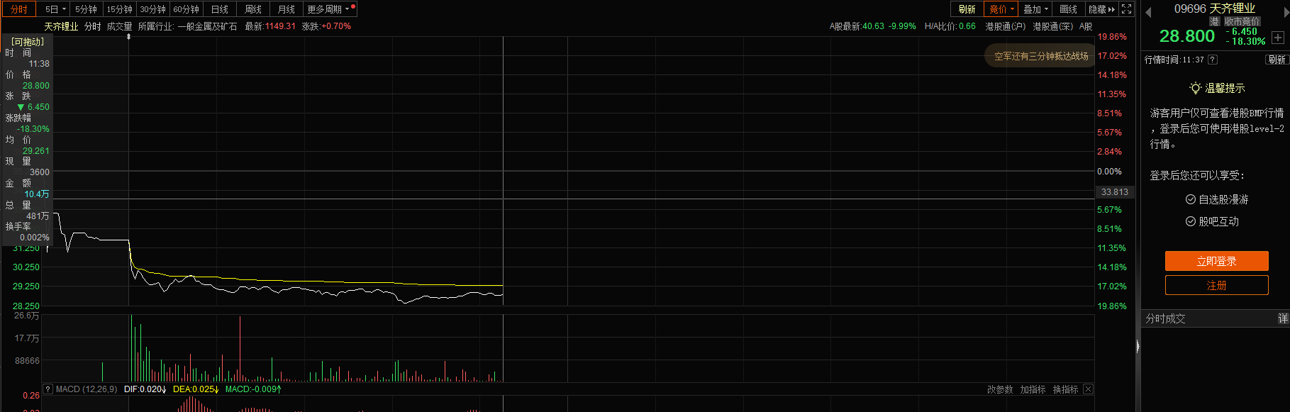 天齐锂业港股同样遭遇大跌,截至午间收盘跌超18%。