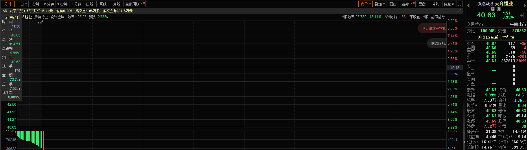 受业绩大幅亏损影响,4月24日早盘,天齐锂业A股一字跌停,截至午间收盘,该股报40.63元,跌停板封单超26万手,市值报收666.8亿。