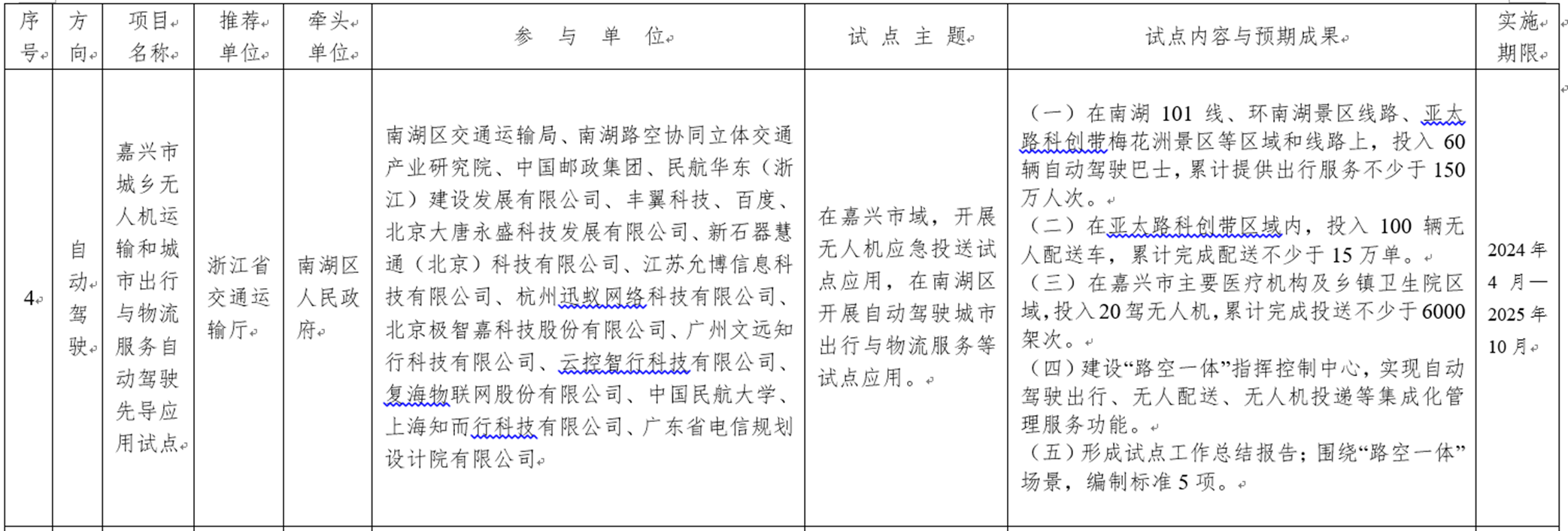 该项目试点内容有多项涉及无人机/“路空一体”:在嘉兴市主要医疗机构及乡镇卫生院区域,投入20驾无人机,累计完成投送不少于6000架次;建设“路空一体”指挥控制中心,实现自动驾驶出行、无人配送、无人机投递等集成化管理服务功能;围绕“路空一体”场景,编制标准5项。
