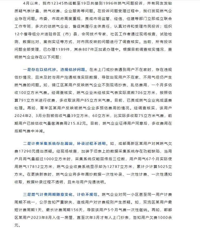 成都市场监管关于市民反映燃气相关问题调查核实情况的通报。