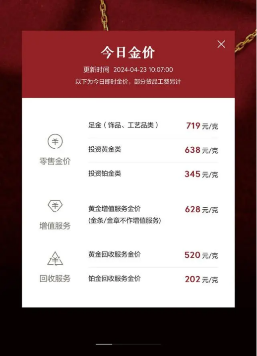 国内金价同样迎来回调,今天(23日),多家珠宝品牌零售金价均下调14元左右,如周大福、曼卡龙等品牌,昨天挂牌为733元/克,今天已调整至719元/克。
