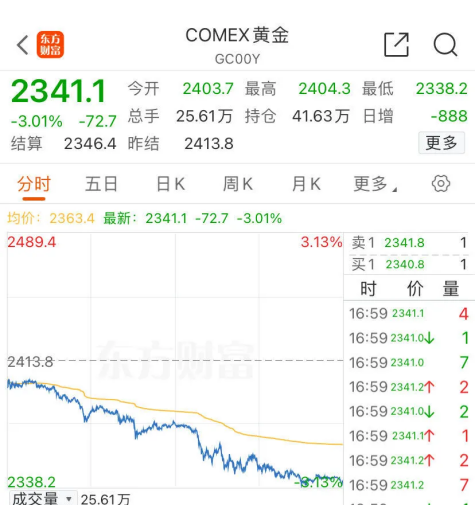 当地时间4月22日,伦敦现货黄金下跌2.72%,报2326.810美元/盎司,创近两年单日最大跌幅;COMEX(纽约商品交易所)黄金期货下跌3.01%,报2341.1美元/盎司;COMEX白银期货下跌5.58%,报27.235美元/盎司。