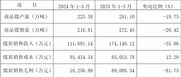 大有能源4月23日发布公告,公司2024年一季度商品煤产量225.58万吨,同比下降19.755;商品煤销量216.81万吨,同比下降20.42%;煤炭销售收入11.17亿元,同比下降35.86%;煤炭销售毛利1.63亿元,同比下降81.75%。
