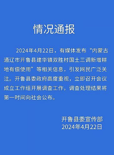 4月23日凌晨,“开鲁融媒”发布情况通报称,4月22日,有媒体发布“内蒙古通辽市开鲁县建华镇双胜村国土三调新增耕地有偿使用”等相关信息,引发网民广泛关注。开鲁县委政府高度重视,立即召开会议成立工作组开展调查工作,调查处理结果将第一时间向社会公布。