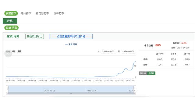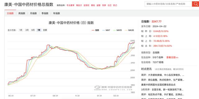 经历了2023年下半年的回落,2024年初至今,中药材涨价潮又有了“卷土重来”的趋势。4月22日,康美·中国中药材价格总指数为2247.77点,较去年同期上涨14.5%,为历史新高。