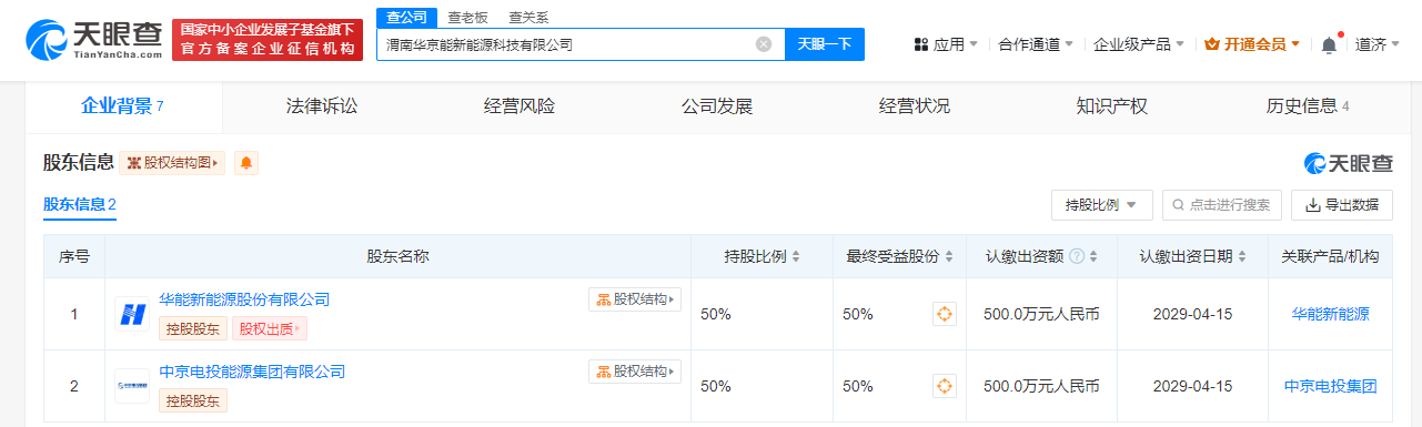 天眼查App显示,近日,渭南华京能新能源科技有限公司成立,法定代表人为徐庆鸿,注册资本1000万人民币,经营范围含风力发电技术服务、太阳能发电技术服务、新兴能源技术研发等。股东信息显示,该公司由华能新能源股份有限公司和中京电投能源集团有限公司共同控股。