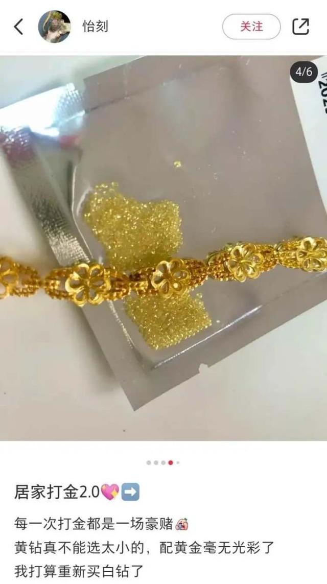32岁的怡刻第一次买金饰是去年3月,那只古法金手镯戴了没多久就变形了。她看到网上有卖模具的,当即决定尝试自己在家熔金打金。“我从小动手能力比较强,所以没考虑打金店。”