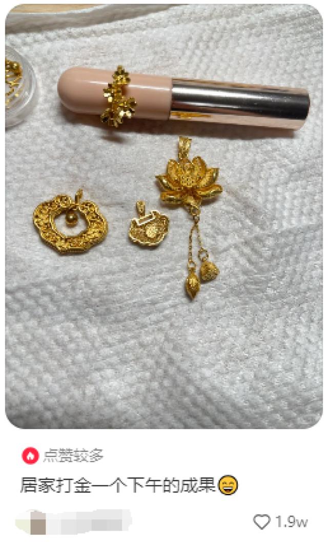 但这难不倒机智的年轻人,他们还可以选择“自己动手,丰衣足食”。最近涌现的一批居家打金的手工博主,就擅长徒手做出精致度颇高的金饰,那手艺活谁看了都得感慨一句“金价把人逼成什么样了”。