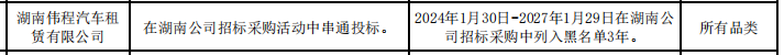 公告显示,湖南伟程汽车租赁有限公司,在湖南公司招标采购活动中串通投标。