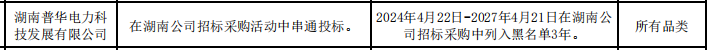 公告显示,湖南普华电力科技发展有限公司,在湖南公司招标采购活动中串通投标。