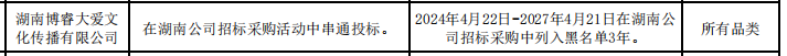 公告显示,湖南博睿大爱文化传播有限公司,在湖南公司招标采购活动中串通投标。
