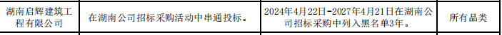 公告显示,湖南启辉建筑工程有限公司,在湖南公司招标采购活动中串通投标。