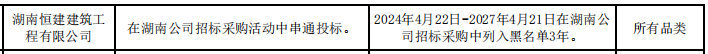 公告显示,湖南恒建建筑工程有限公司,在湖南公司招标采购活动中串通投标。