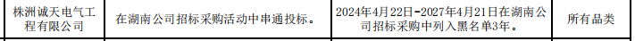公告显示,株洲诚天电气工程有限公司,在湖南公司招标采购活动中串通投标。