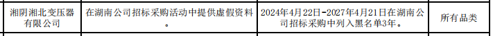 公告显示,湘阴湘北变压器有限公司,在湖南公司招标采购活动中提供虚假资料。