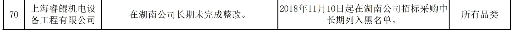 公告显示,上海睿鲲机电设备工程有限公司在湖南公司长期未完成整改。相关处理措施为,2018年11月10日起在湖南公司招标采购中长期列入黑名单。处理范围为,所有品类。