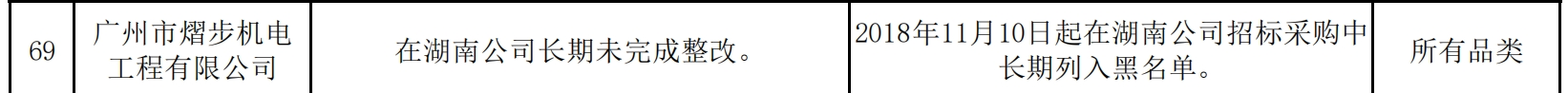 公告显示,广州市熠步机电工程有限公司在湖南公司长期未完成整改。相关处理措施为,2018年11月10日起在湖南公司招标采购中长期列入黑名单。处理范围为,所有品类。