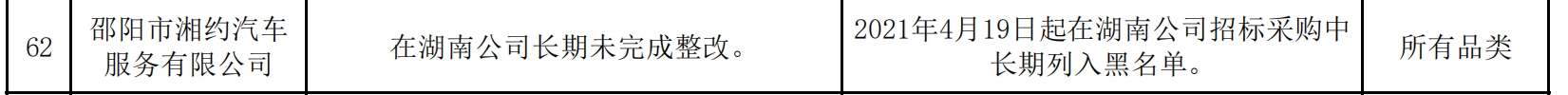 公告显示,邵阳市湘约汽车服务有限公司在湖南公司长期未完成整改。相关处理措施为,2021年4月19日起在湖南公司招标采购中长期列入黑名单。处理范围为,所有品类。