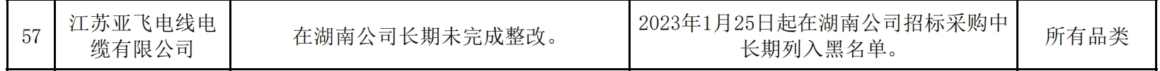 公告显示,江苏亚飞电线电缆有限公司在湖南公司长期未完成整改。相关处理措施为,2023年1月25日起在湖南公司招标采购中长期列入黑名单。处理范围为,所有品类。