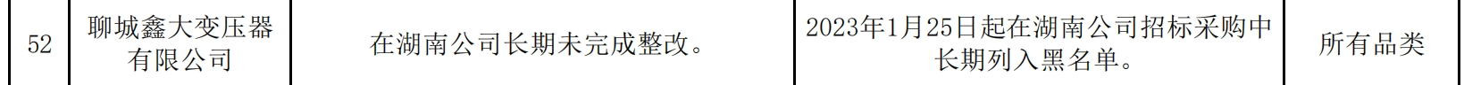 公告显示,聊城鑫大变压器有限公司在湖南公司长期未完成整改。相关处理措施为,2023年1月25日起在湖南公司招标采购中长期列入黑名单。处理范围为,所有品类。