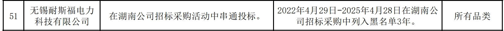 公告显示,无锡耐斯福电力科技有限公司在湖南公司招标采购活动中串通投标。相关处理措施为,2022年4月29日-2025年4月28日在湖南公司招标采购中列入黑名单3年。处理范围为,所有品类。