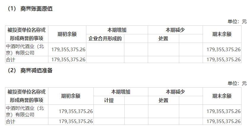 直到2022年上半年,天佑德酒半年报披露中酒时代实现净利润156万元。2023年年报显示,中酒时代实现营业收入1.52亿元,但仅实现净利润183.49万元,而形成的商誉期末余额则高达1.79亿元。