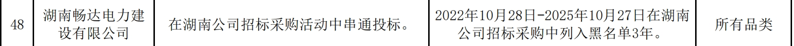 公告显示,湖南畅达电力建设有限公司在湖南公司招标采购活动中串通投标。相关处理措施为,2022年10月28日-2025年10月27日在湖南公司招标采购中列入黑名单3年。处理范围为,所有品类。